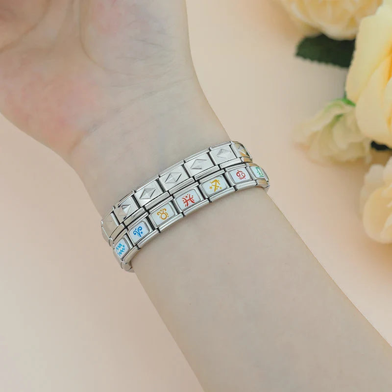 Our bracelets are made of 18 Charm links that expand & contract to suite your wrist perfectly. All of our Charms are compatible so you can easily add & remove links as you see fit.