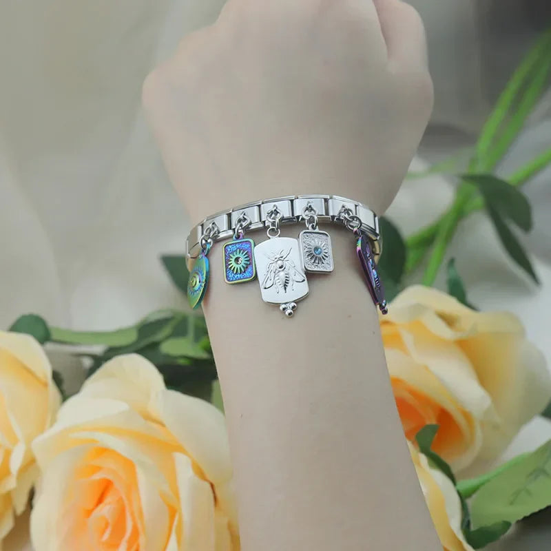 Our bracelets are made of 18 Charm links that expand & contract to suite your wrist perfectly. All of our Charms are compatible so you can easily add & remove links as you see fit.