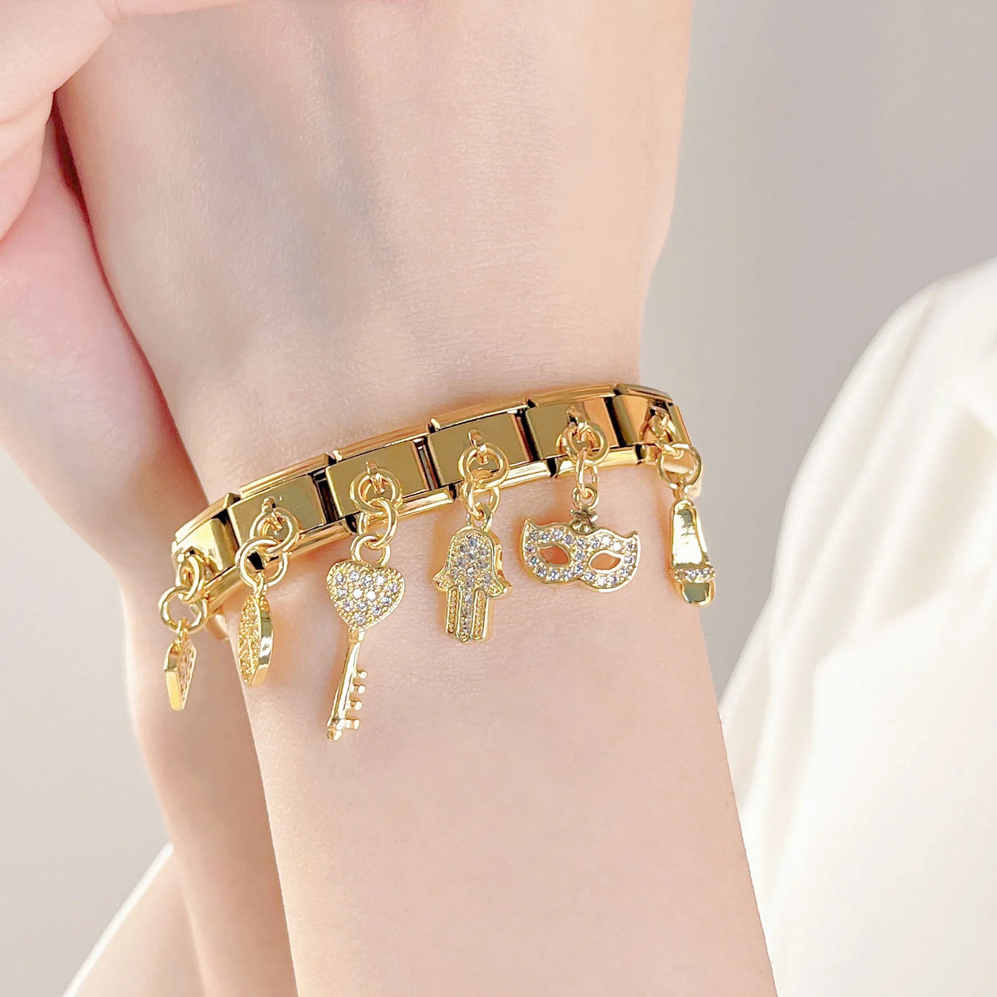 Our bracelets are made of 18 Charm links that expand & contract to suite your wrist perfectly. All of our Charms are compatible so you can easily add & remove links as you see fit.
