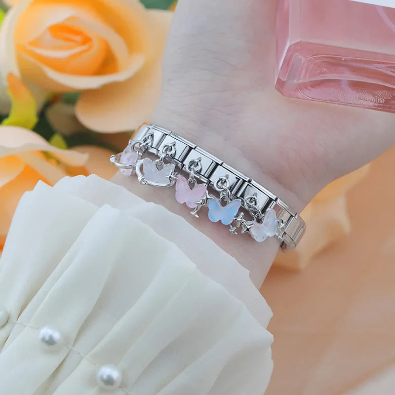 Our bracelets are made of 18 Charm links that expand & contract to suite your wrist perfectly. All of our Charms are compatible so you can easily add & remove links as you see fit.