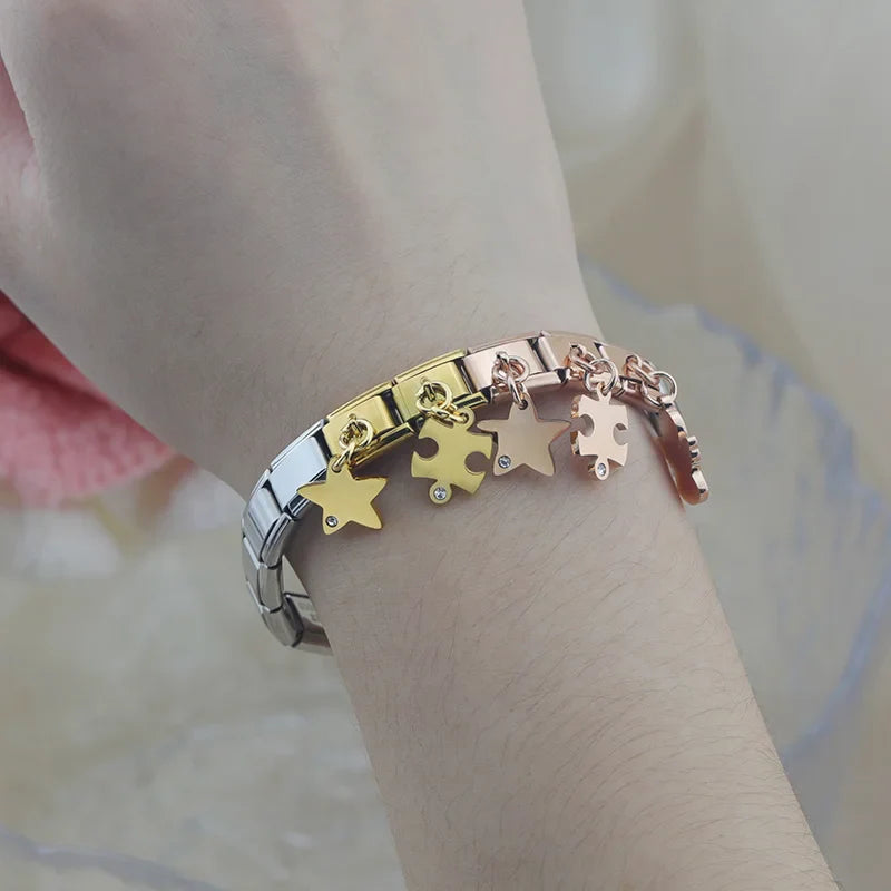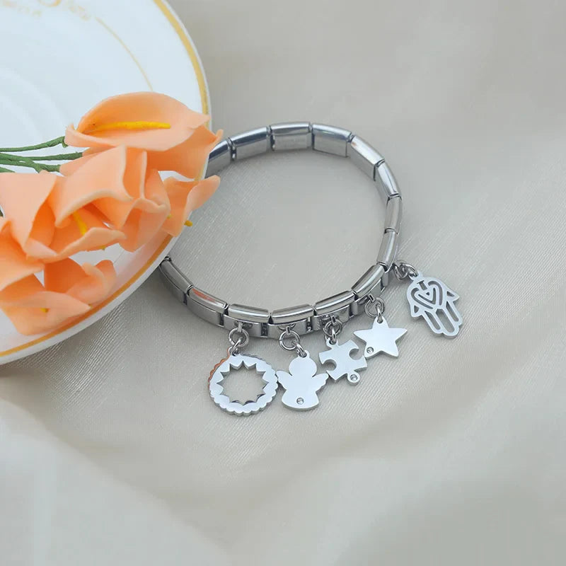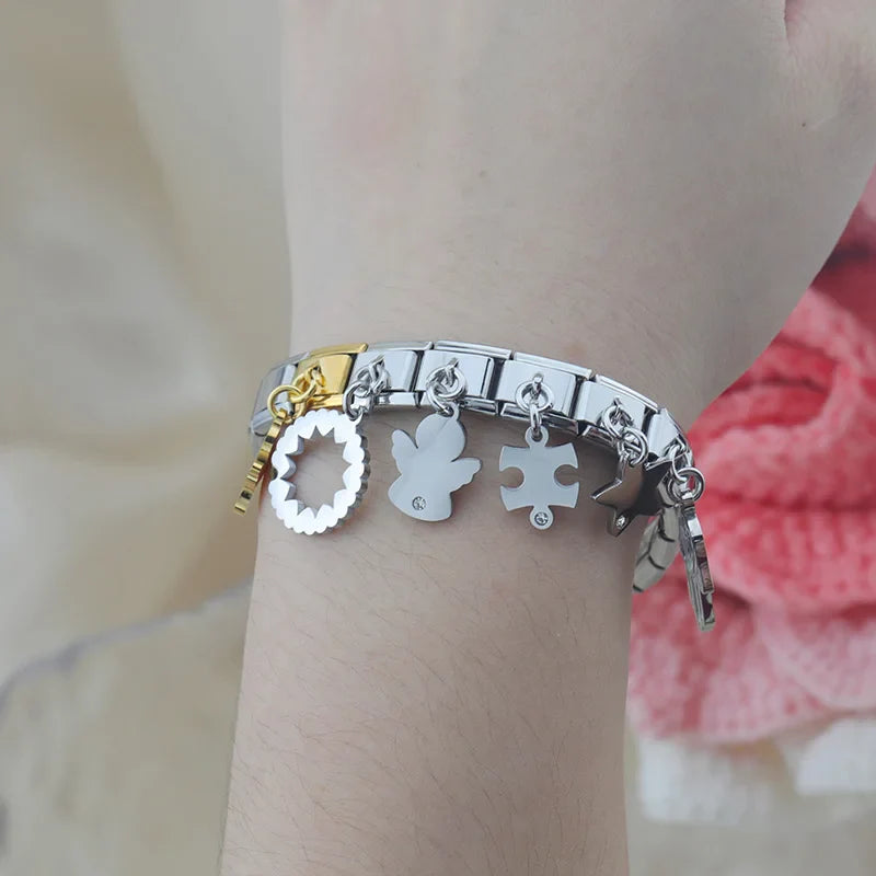 Our bracelets are made of 18 Charm links that expand & contract to suite your wrist perfectly. All of our Charms are compatible so you can easily add & remove links as you see fit.