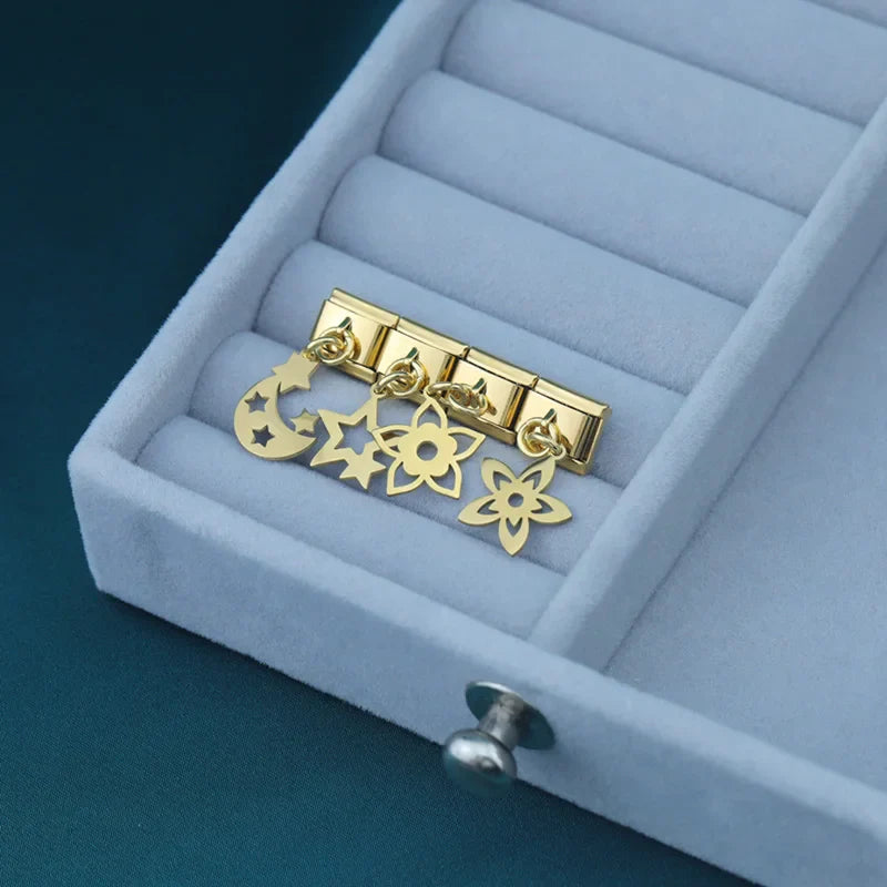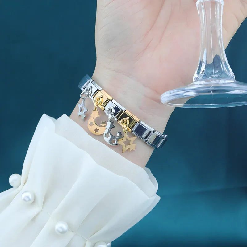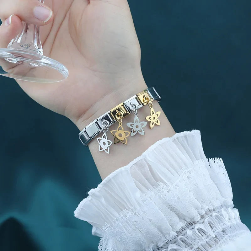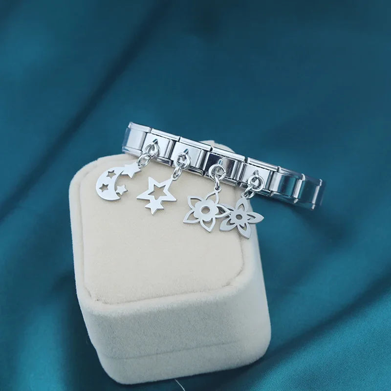 Our bracelets are made of 18 Charm links that expand & contract to suite your wrist perfectly. All of our Charms are compatible so you can easily add & remove links as you see fit.