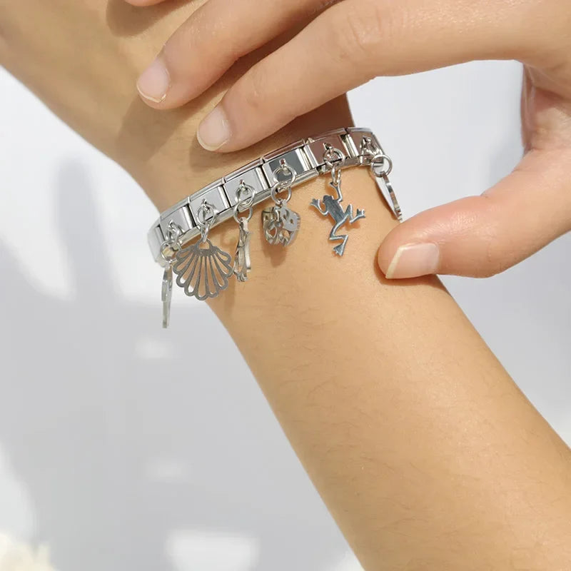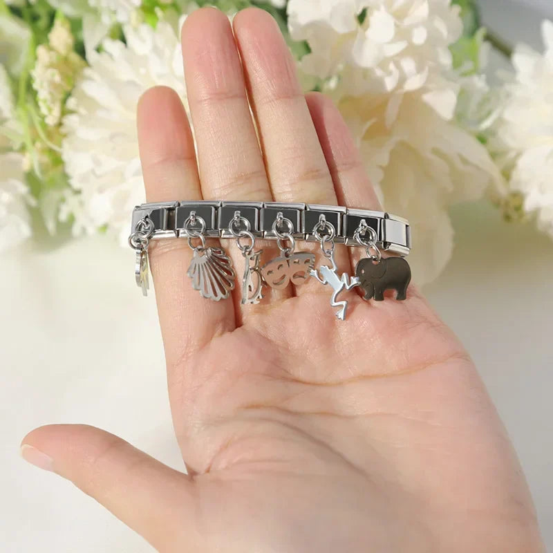 Our bracelets are made of 18 Charm links that expand & contract to suite your wrist perfectly. All of our Charms are compatible so you can easily add & remove links as you see fit.