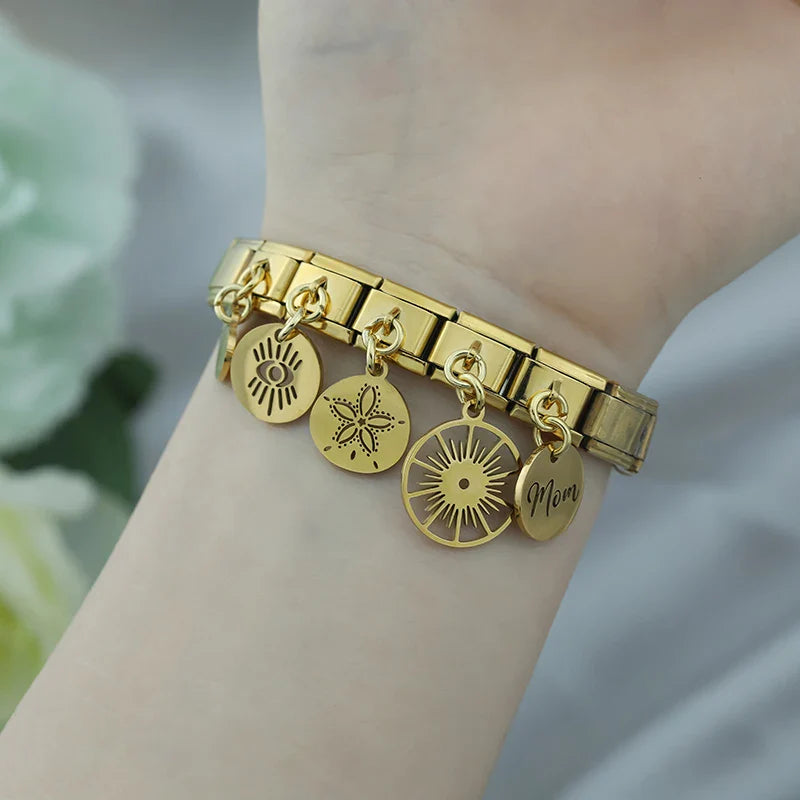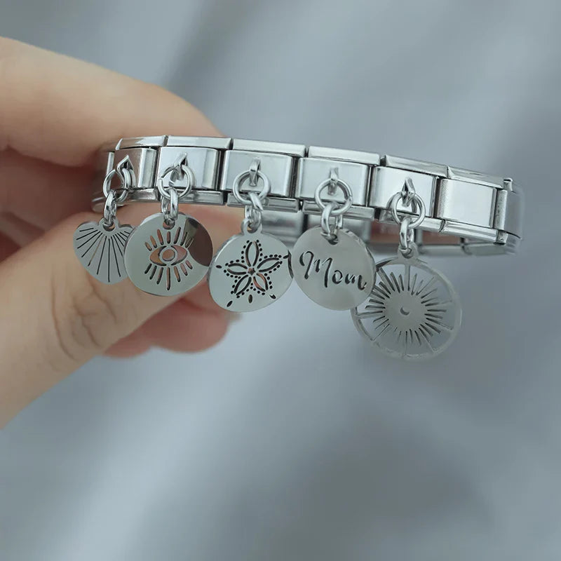 Our bracelets are made of 18 Charm links that expand & contract to suite your wrist perfectly. All of our Charms are compatible so you can easily add & remove links as you see fit.